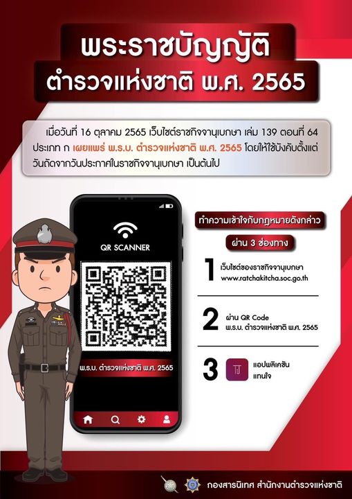 ช่องทางการทำความเข้าใจกับ พระราชบัญญัติตำรวจแห่งชาติ พ.ศ.2565 20 ตุลาคม 2022 โดย saladang police / ข่าวประชาสัมพันธ์ Facebook - กองบัญชาการตำรวจนครบาล - บช.น. Metropolitan Police Bureau Youtube - Police Radio (Thailand)