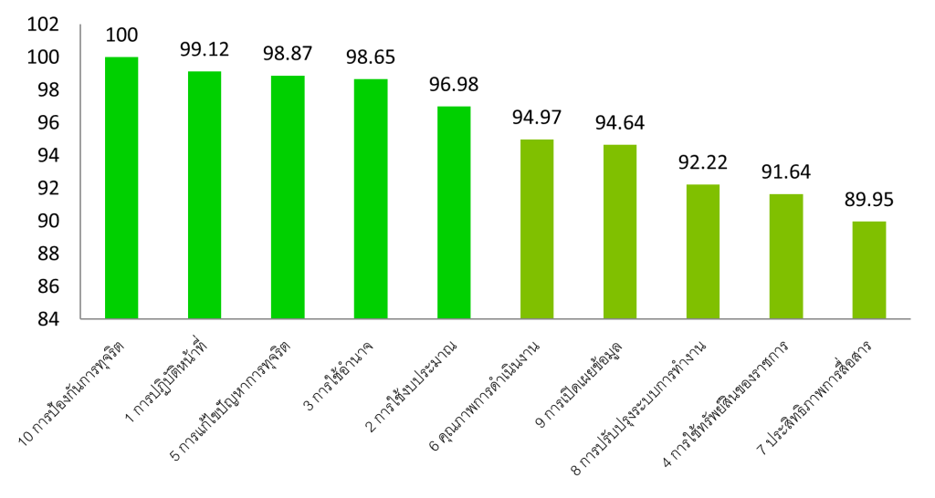 แผนภาพ : กราฟแท่งแสดงผลการประเมินคุณธรรมและความโปร่งใสในการดำเนินงานของสถานีตำรวจนครบาลศาลาแดง ประจำปีงบประมาณ พ.ศ.2565 ในภาพรวม เรียงตามคะแนนตามตัวชี้วัด